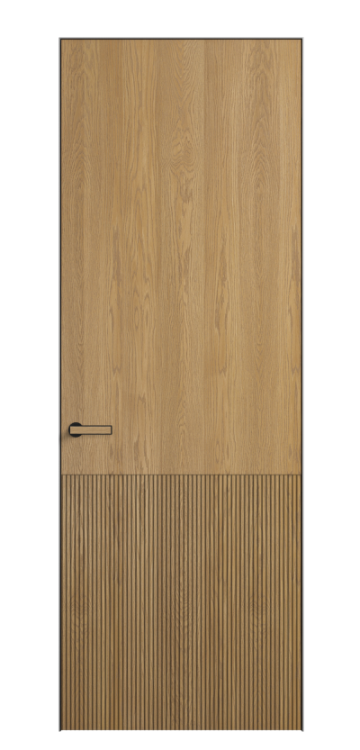 Это полотна с рельефной фрезеровкой. Этот прием делает интерьер объемным, тактильным, вносит интересную текстуру и создает современный образ. Волнистый рельеф может быть выполнен по ламелям из массива дуба в древесных матовых отделках, либо исполнен по натуральному и экологически безопасному материалу — ХДФ, покрытому гладкой эмалью актуальных оттенков.